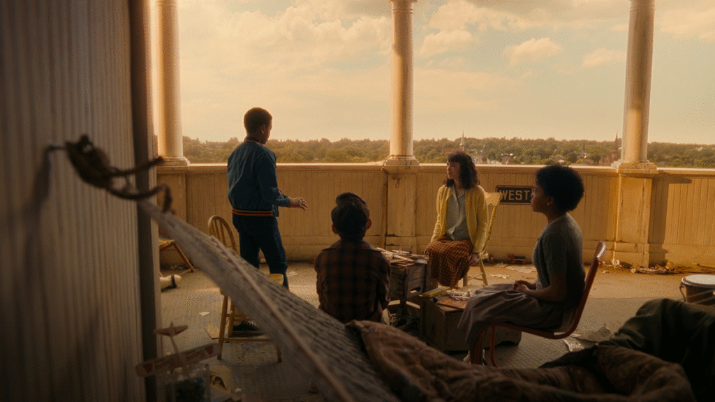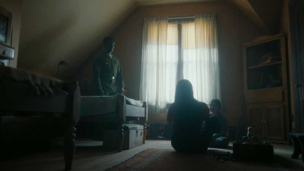 Sin poder dormir (normal, vaya), Will se levanta y se pone a observar por la ventana a través de su telescopio. Es entonces cuando el payaso 🤡 hace una aparición… ¡pero no es Pennywise! Por la silueta, la forma del pelo y la ropa, podemos deducir que es la niña payaso que vimos en el episodio anterior, o al menos una versión de ella… Leroy, al oír los gritos de su hijo, sale fuera para ver que es lo que observa a su hijo, para solo ver de nuevo un globo rojo atrapado en un árbol.